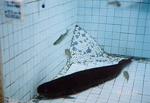 ![]() ↑土産屋で飼われていた大鰻。ナマズではない! この水槽に敷いてあるタイルは一辺7.5cm。 池田湖の周辺の土産屋にはあちこちには、いろんな 「日本一」や「世界一」の大鰻が飼われている。(笑) |