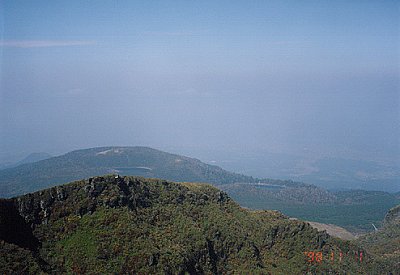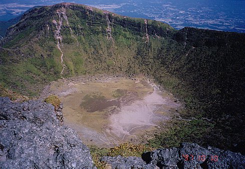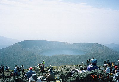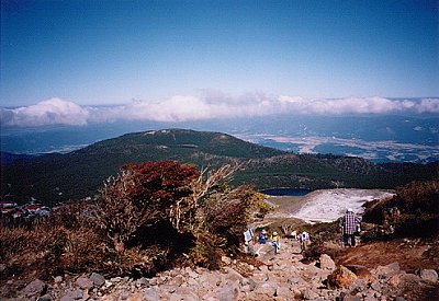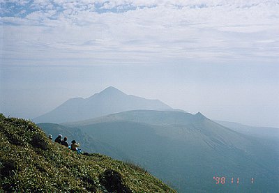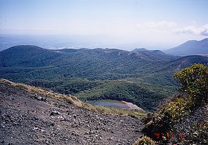 ↑韓国岳の南東側の眺め。中央下の池が琵琶池。 その向こう左から丸岡山、大幡池(水面が少し見える)、大幡山。 右奥にちょっと見えるのは高千穂峰。 |