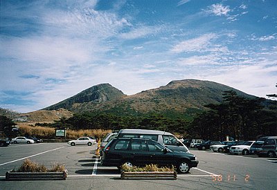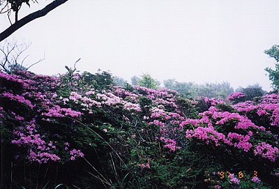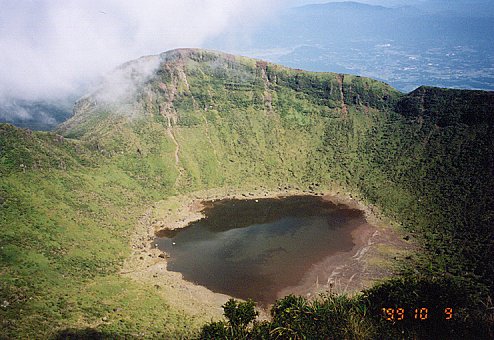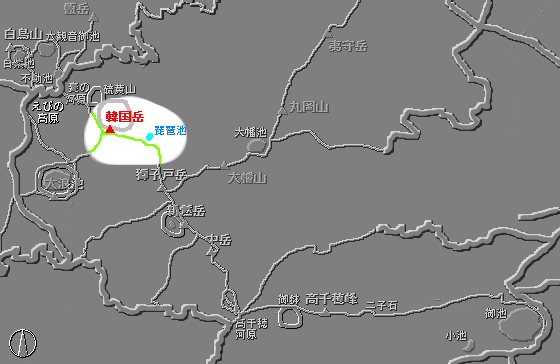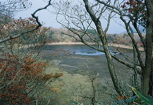 ↑韓国岳の南東側急斜面を降りきった所にある琵琶池。 直径300m、水深2m。 縦走路から潅木ごしに見ることができる。 |
