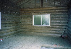 ↑韓国岳避難小屋の中:ログハウス風。 土間、換気穴、サッシ、ホウキ、ドライペット付きで なかなか快適。 鹿児島の山小屋は、手入れの行き届いたものが多いので いつも感激する。 |