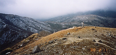 ↑1381mピークからの眺め:中央右よりに道標が見える。