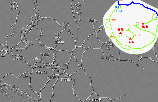 九重連山の一番東に位置し、高塚(1587m)・天狗(1556m)・前岳(1334m)