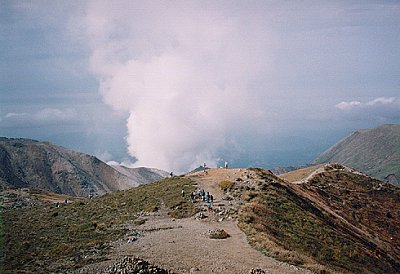 山頂標の真後ろの山は星生山、蒸気を出してる右の山は硫黄山。
