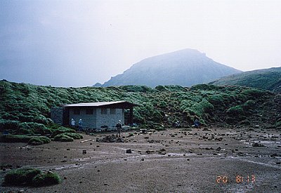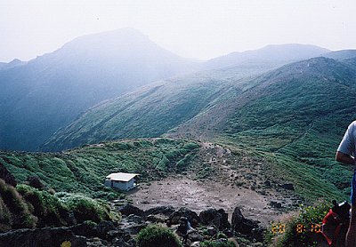 ↑久住避難小屋:西千里ヶ浜を過ぎた所から眺める。