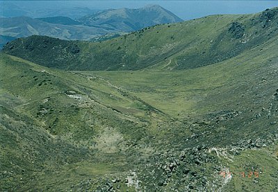 ↑久住山頂から眺めた西千里ヶ浜、中央の広大な平地。
