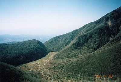 ↑鉾立峠近くから見た佐渡窪の湿地。