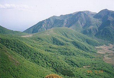 ↑平治岳から見た立中山。写真中央のなだらかな盛り上がりがそれ。