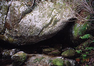 片方の巨石の下、岩屋のような所から清水がちょろちょろ流れ込んでくる。