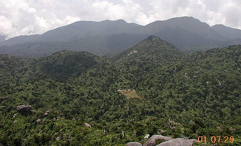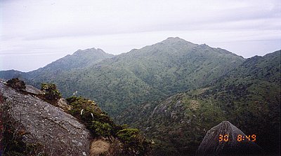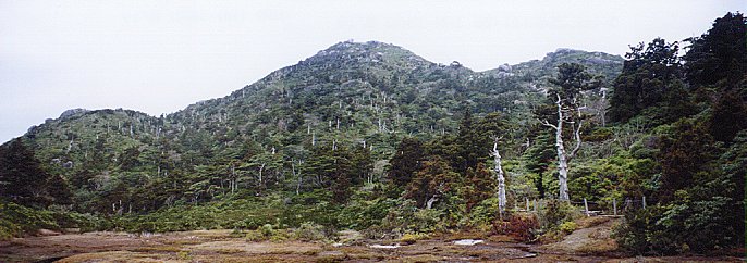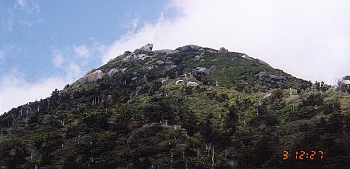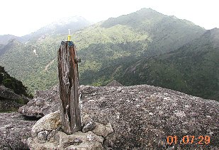 ![]() ↑山頂から北側の眺め:九州標高の上位三位をまとめて見る! 左から永田岳、宮之浦岳。宮之浦岳右肩の小さなコブが栗生岳。 それぞれ九州第2位、1位、3位。屋久三岳でもある。 |