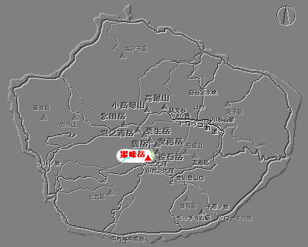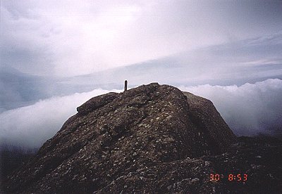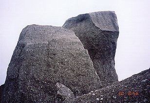![]() ↑黒味岳山頂の巨岩: これを時計回りに登ると、左の写真の山頂標にたどり着く。 |