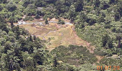↑山頂から南側の眺め:中央に見える黄緑色の無木帯は花之江河。