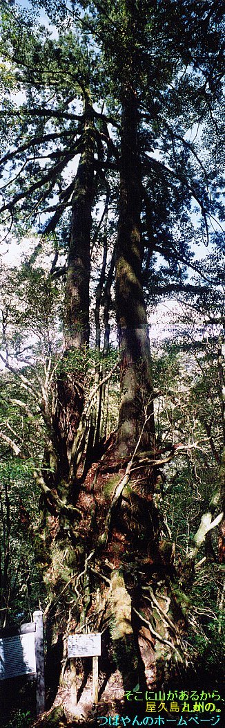 上方の杉が倒れ込んで、2本が合体して出来た(屋久島では)比較的若い杉。